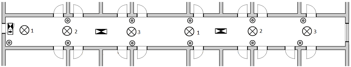 Evo nam primjera „većeg“ hodnika u nekoj stambenoj zgradi. Sve smo rasporedili „po propisu“ – tipkala, svjetiljke i protupaničnu rasvjetu. Međutim, da li i tu ima mjesta za poboljšanja?